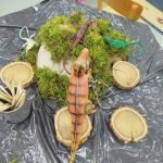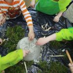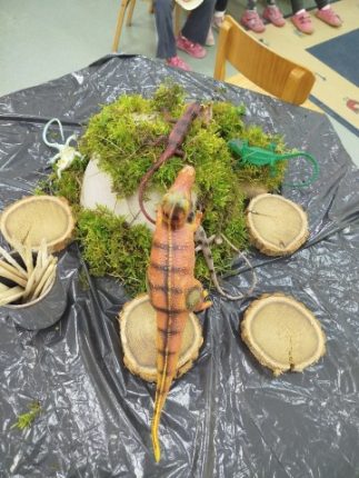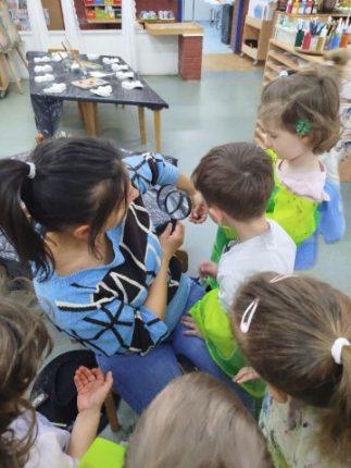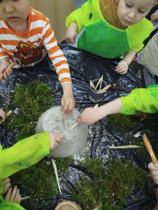 Danas smo djeci u centru za likovnost ponudile glinu i grančice. Za vrijeme aktivnosti djeci smo pustile šumske zvukove (slap, cvrkut ptica, vjetar, šuštanje lišća…). Aktivnost se odvijala u manjim grupama.