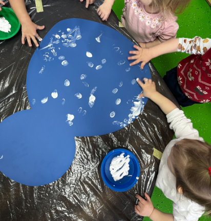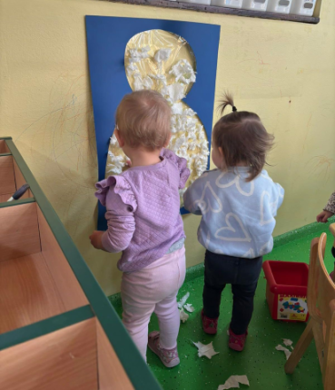 U odgojnoj skupini „Loptice“ djeca na temu „Snjegović“ likovnim aktivnostima i tehnikama trganja i lijepljenja papira te bojenja prstima razvijaju finu motoriku šake i prstiju i stjecanjem iskustva dodira razvijaju taktilnu percepciju.