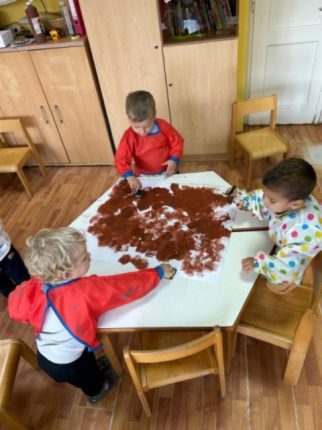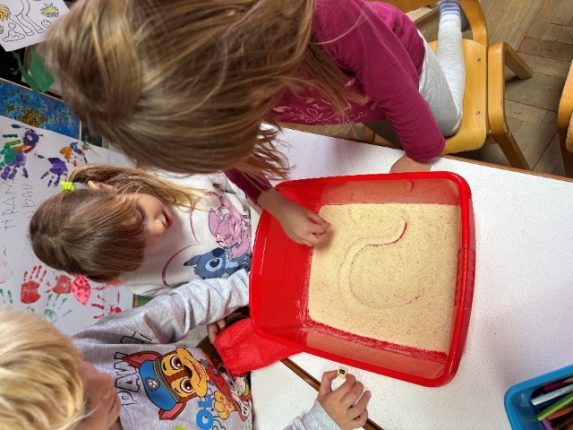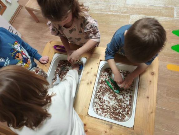 U odgojnoj skupini Ježići djeca za vrijeme kruga razgovarala o emocijama, imenovali su emocije te slagali puzzle od dva djela koji prikazuju izraze lica. Također, razvijali su taktilnu percepciju u igri rasipnim materijalom poput obojene riže, modelirali su slano tijesto i domaći plastelin.