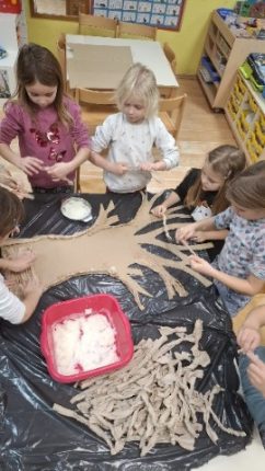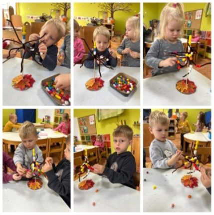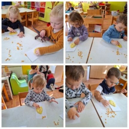 Odgojna je skupina Ježići razvijala prostornu orijentaciju pokretnom igrom „Dan – noć.“ Razvijali su finu motoriku i okulomotornu koordinaciju nizanjem perlica na čupavu žicu u obliku stabla te modeliranjem slanog tijesta i utiskivanjem kukuruza u tijesto.