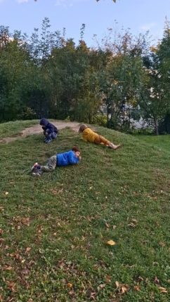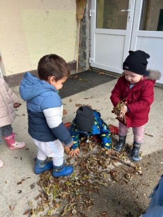 Odgojna skupina Ptičice iskoristila je sunčano jesensko vrijeme za dulje boravke na zraku, gdje su djeca pokazala osobit interes za igru lišćem. Lišće su bacali u zrak, preskakali hrpe lišća te istraživali boje, oblike i površinu raznih listića.
