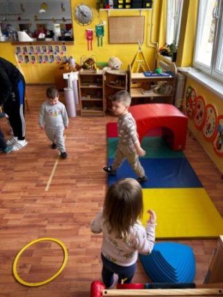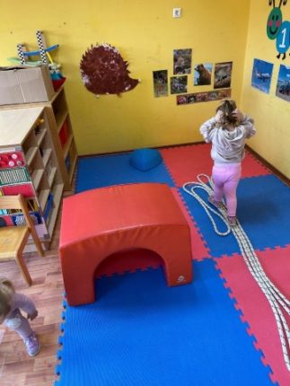 Poticanje razvoja fine motorike šake i prstiju u odgojnoj skupini Ježići ostvareno je trganjem i ljepljenjem papirića te rasipnim materijalom gdje su punili i praznili čašice. U sobi je dnevnog boravka oformljen poligon prepreka koji se sastojao od hodanja po suženoj površini i ASCO elemenata za poticanje prirodnog oblika kretanja u djece.