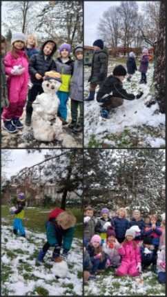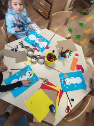 U odgojnoj skupini Leptirići djeca su upoznata s igrokazom “Zeko i snjegović”. Provedena je likovna aktivnost slikanja snjegovića slikarskom tehnikom tempere te kaširanja balona za izradu vlastitih lutkica prema već spomenutom igrokazu. U centru početnog čitanja i pisanja, djeci je ponuđena slikovnica “Priča o tri snjegovića” te igra vizualnog slaganja slova prema predlošku. Ovim su aktivnostima djeca obogaćivala vokabular, razvijala pažnju i koncentraciju, operativno mišljenje uspoređivanjem, zapažanjem i stvaranjem pojmova te stvaralačka svojstva.