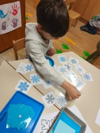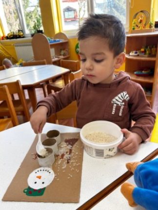 Odgojiteljice odgojne skupine Ptičice su posebnu pažnju obratile na aktivnosti za poticanje razvoja fine motorike šake i prstiju te okulomotorne koordinacije. Djeca su usvajala pincetni hvat, rezanje škaricama po liniji te nizanje kamenčića. Također, obradili su dinamiku u pjesmici “Pahuljice padajte”, a pjesmicu “Zvončići” djeca su svirala udaraljkama u metru i ritmu.